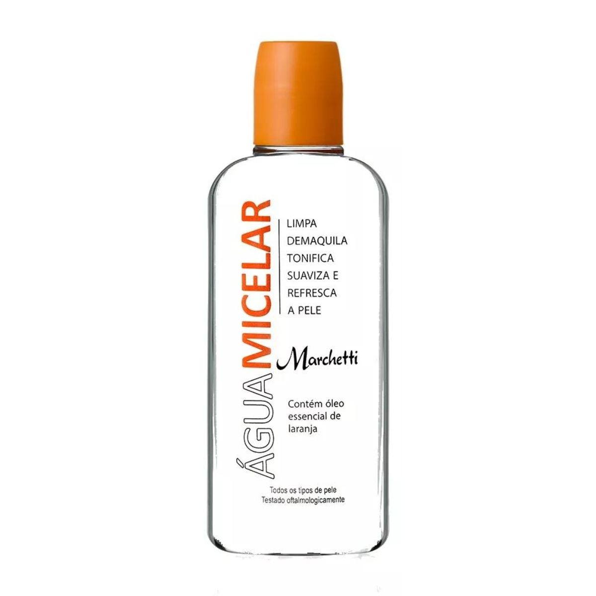 A Água Micelar Marchetti é um produto sem enxague, multifuncional que limpa, demaquila, suaviza, purifica, tonifica, reequilibra o PH da pele e refresca. Tudo isso devido a sua formulação inovadora, não oleosa, que possui óleo essencial da laranja (não oleoso). Indicado para todos os tipos de pele. Testado oftalmologicamente.