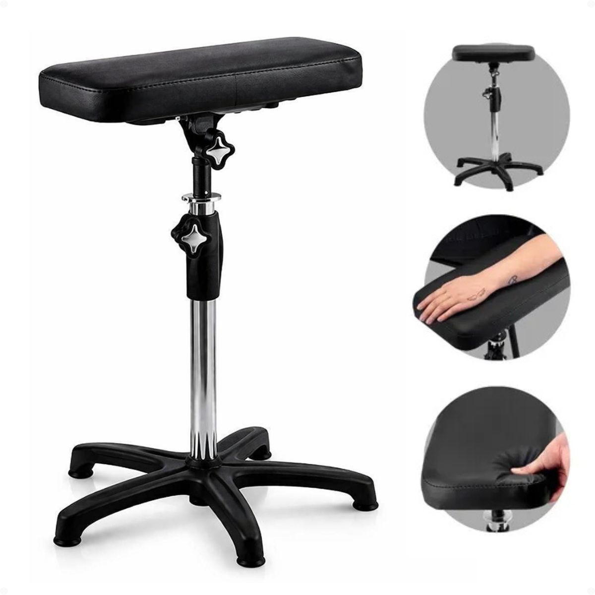 Pensada para proporcionar maior conforto ao cliente e facilitar o trabalho do tatuador, o Apoio de Braço Revolution possui estrutura de aço cromado com altura regulável e regulagem de ângulo de apoio. Permite postura confortável do tatuador, garantindo maior tempo de trabalho. Pode ser desmontado para facil locomoção e melhor uso do espaço. Ideal para convenções e eventos.