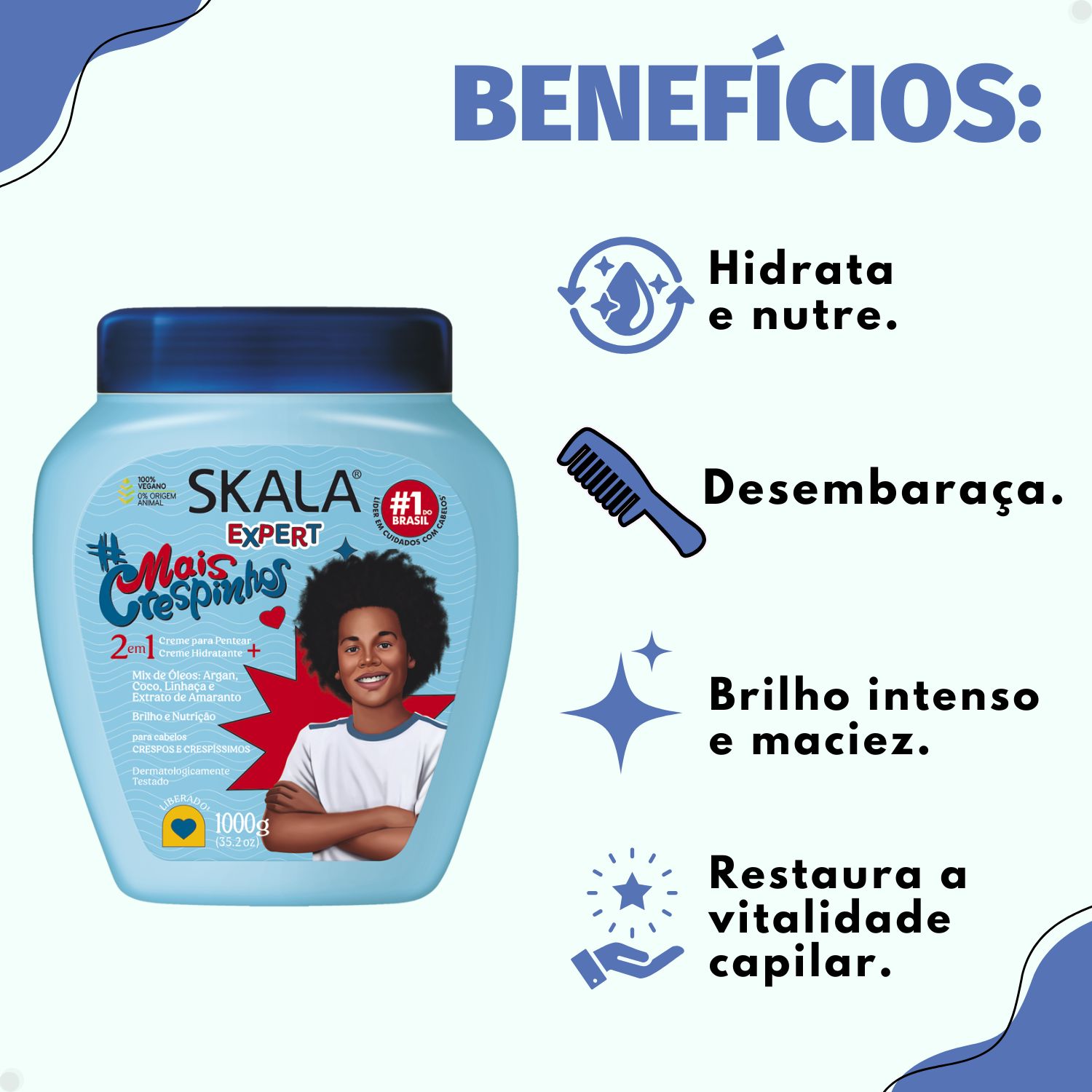 Descubra o poder do Creme De Tratamento Skala Expert Mais Crespinhos 1000g, o aliado perfeito para a rotina de cuidados com cabelos crespos e crespíssimos. Desenvolvido pela SKALA, este creme 2 em 1 oferece uma solução completa para nutrir, hidratar e proporcionar brilho intenso, combatendo o frizz de forma eficaz. Sua fórmula inovadora foi criada para desembaraçar os fios e fortalecer a fibra capilar, garantindo cabelos mais saudáveis e definidos.