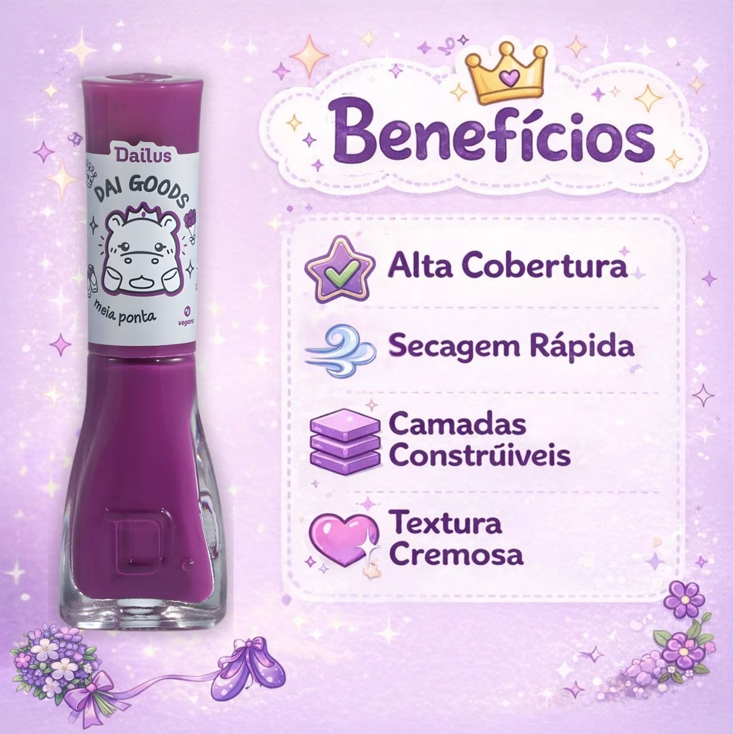 O Esmalte Cremoso Dailus Dai Goods 8ml é a escolha perfeita para quem deseja unhas elegantes e cheias de estilo em qualquer momento. Ideal para o dia a dia, eventos especiais, ou para criar nail arts e combinações únicas que expressam sua personalidade e criatividade.