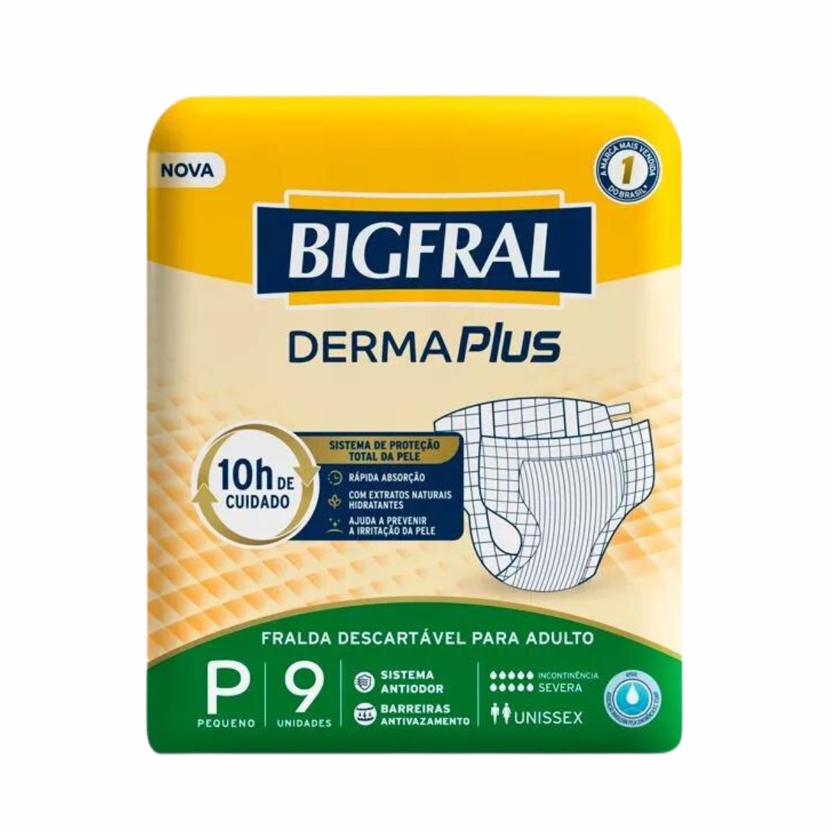 A nova Bigfral Derma Plus é a primeira fralda para adultos com extratos naturais hidratantes, que ajuda a prevenir irritações, mantendo a pele protegida e saudável, além de garantir até 10h de cuidado para usuários com incontinência urinária severa. Dermatologicamente testado. Produto com Aloe Vera. Rápida absorção. Extratos naturais hidratantes. Barreira antivazamento. Sistema antiodor.