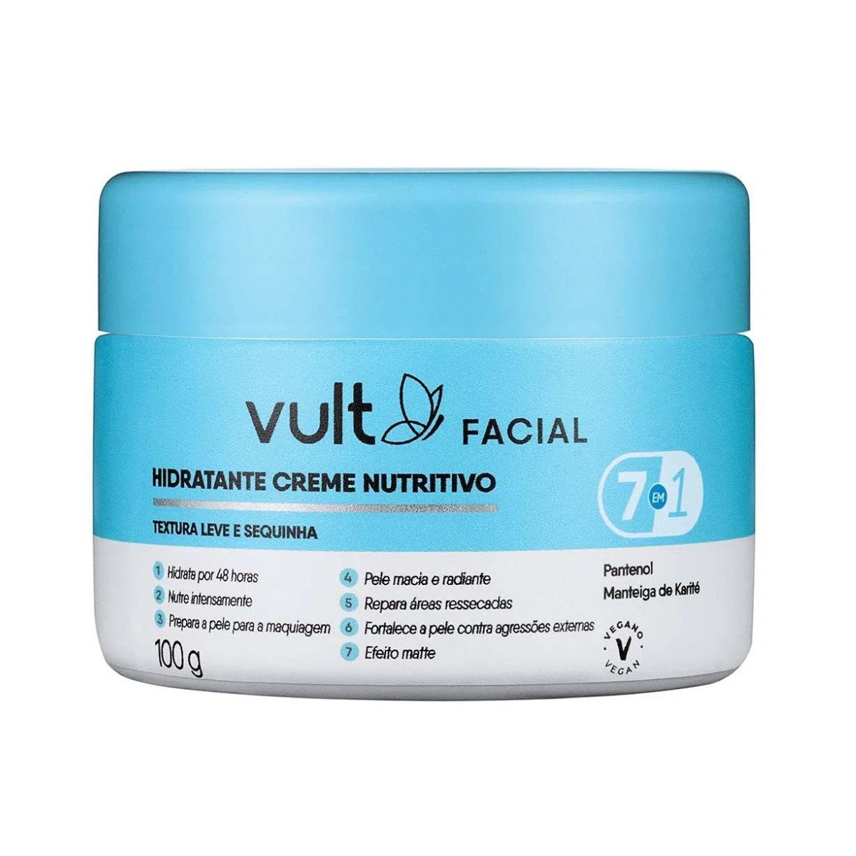 Creme hidratante facial. Vult Care Nutritivo hidrata por 48 horas, reparando as áreas mais ressecadas da pele.Fortalece a barreira de proteção natural da pele, auxilia na proteção contra agressões cotidianas e repara áreas ressecadas. Desenvolvido com Pantenol e Manteiga de Karité, ativos reconhecidos pelo alto poder de hidratação e reparação da pele. Possui textura leve, oil free que auxilia na redução das rugas e linhas finas sem deixar a pele brilhosa.