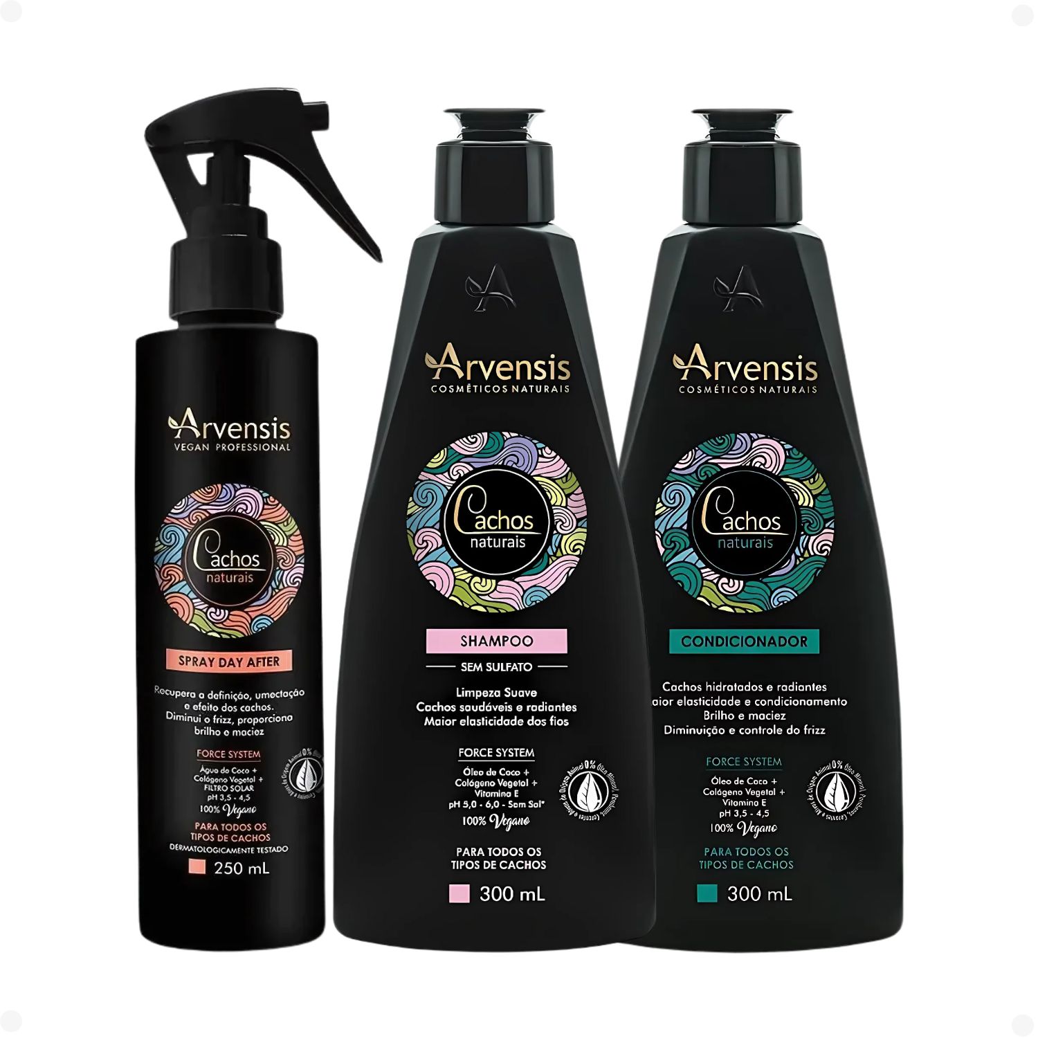 O Kit Arvensis Cachos Naturais é ideal para quem deseja cuidar dos cachos de forma prática, completa e eficaz. O shampoo limpa delicadamente os fios e o couro cabeludo sem ressecar. Sua fórmula suave remove impurezas e preserva a hidratação natural dos cachos. O condicionador desembaraça, hidrata e nutre os fios, ajudando a controlar o frizz e a realçar o brilho. Contém óleo de coco, colágeno vegetal e vitamina E para manter os cachos definidos e saudáveis. O spray day after revitaliza os cachos no dia seguinte à lavagem, devolvendo a forma, a maciez e o brilho sem precisar molhar ou lavar os fios novamente. Textura leve, não pesa e ajuda a controlar o frizz.