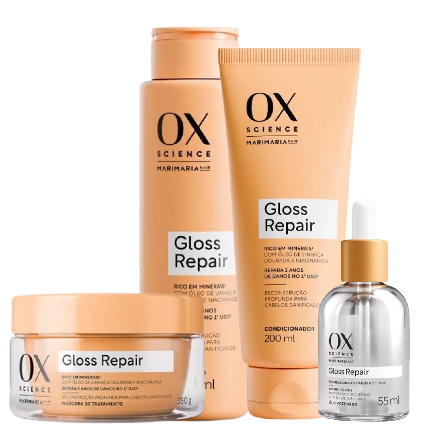Kit OX Science Mari Maria Hair Gloss Repair Shampoo 250ml + Condicionador 200ml + Máscara 180g + Óleo Acetinado 55ml