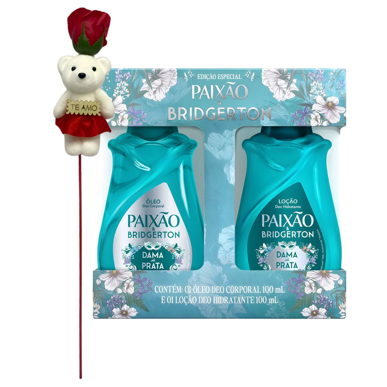 Kit Presente Paixão & Bridgerton: Loção Hidratante e Óleo Corporal 100ml + Rosa com Ursinho
