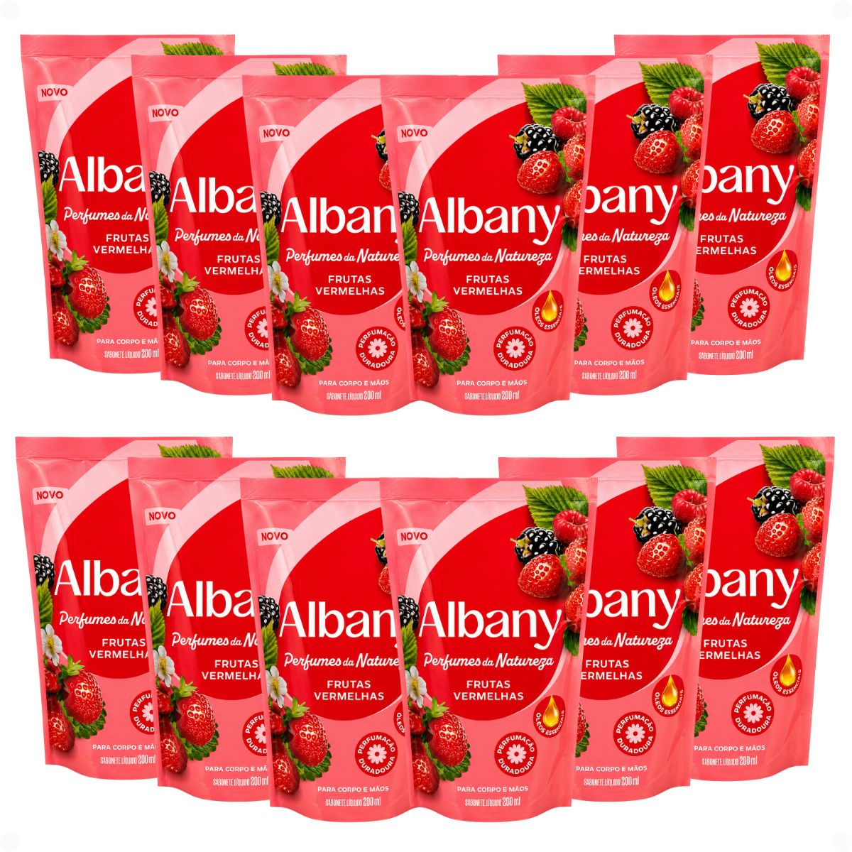 - 12 Refis De Sabonete Líquido Corpo e Mãos Albany Perfumes Da Natureza Frutas Vermelhas 200ml