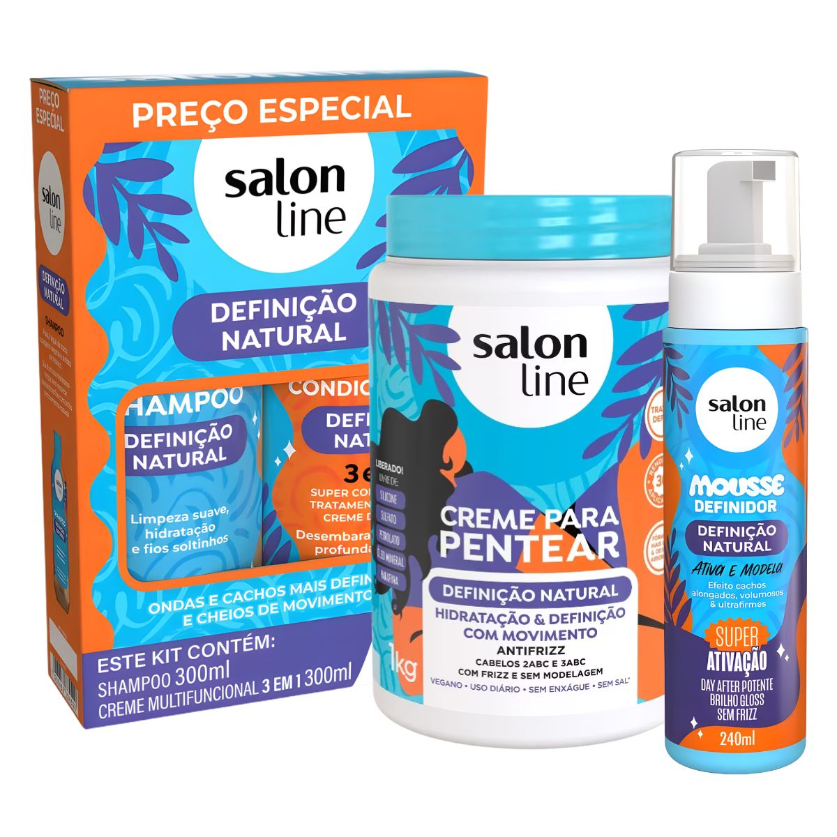 O Kit Salon Line Definição Natural é a solução para quem deseja cabelos limpos, hidratados e com definição duradoura. Composto por shampoo, creme multifuncional, creme para pentear e mousse definidor, ele entrega um cuidado completo desde a limpeza até a finalização.