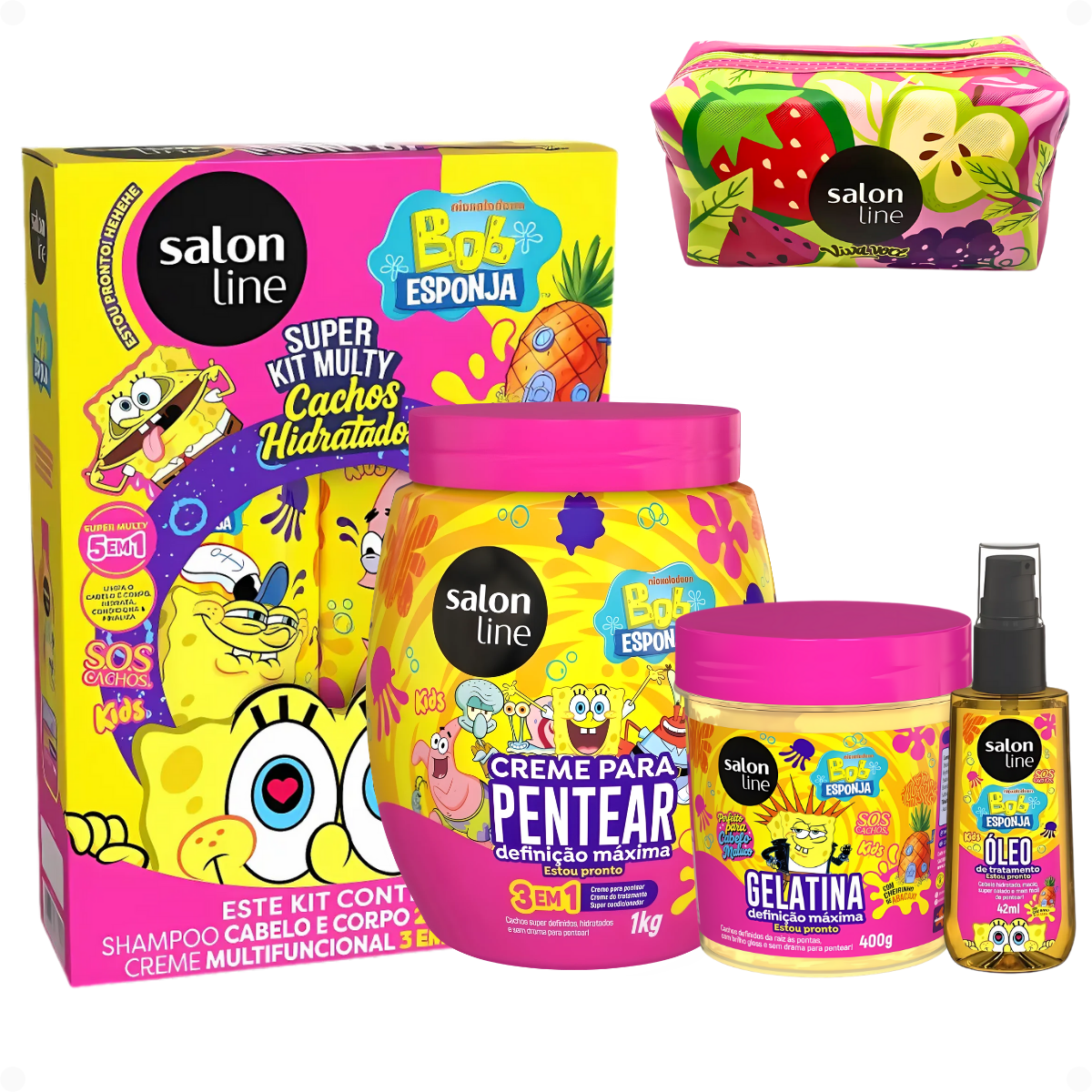 O Kit Salon Line Kids Bob Esponja Sos Cachos Completo + Mimo é a solução perfeita para pais que buscam um cuidado eficaz e divertido para os cabelos cacheados de seus filhos. Desenvolvido especialmente para crianças, este kit completo oferece uma rotina de cuidados que transforma o momento do banho em uma aventura submarina com o personagem mais amado do fundo do mar, o Bob Esponja.