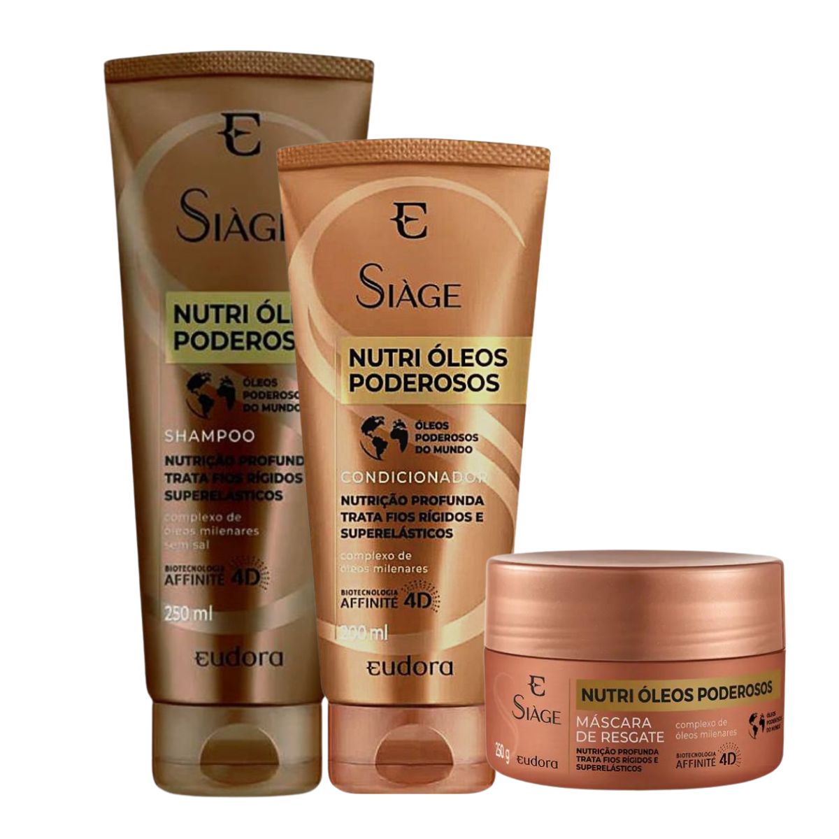 Siage Eudora Nutri Óleos Poderosos Shampoo + Condicionador + Máscara O Kit Siage Nutri Óleos Poderosos de Resgate possui em sua fórmula os óleos mais poderosos do mundo, que tratam fios rígidos e superelásticos já no 1º dia de uso, devolvendo a resistência ideal dos cabelos. O complexo de óleos milenares tem o poder de nutrir e hidratar profundamente os cabelos, garantindo resultados imediatos.