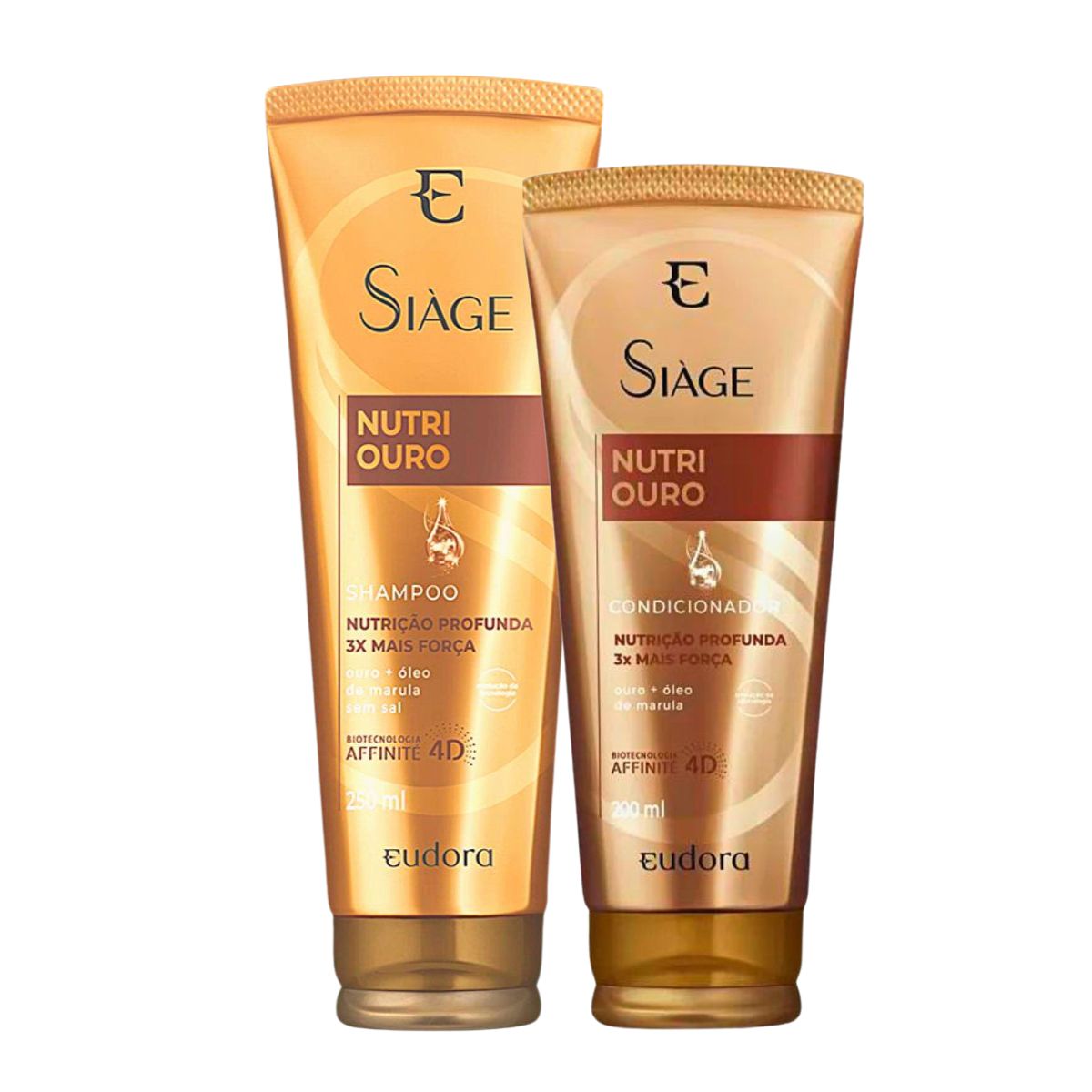 Siage Eudora Nutri Ouro: conta com ação antioxidante, recupera a espessura dos fios e oferece nutrição da raiz às pontas.Enriquecida com Partículas de Ouro e Óleo de Marula, fortalece os fios e garante maciez instantânea.