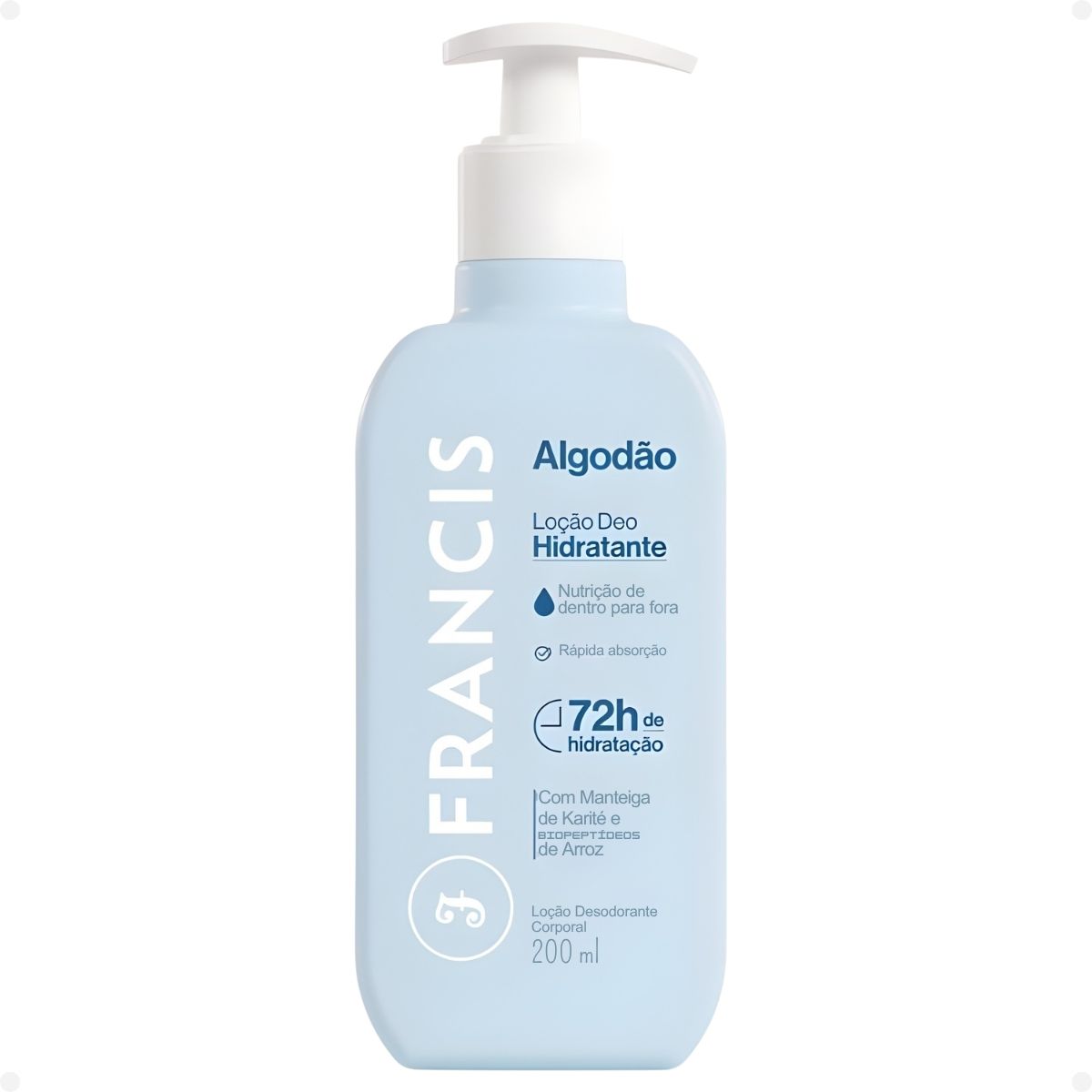 Ideal para todos os tipos de pele, a Loção Francis Algodão é a escolha perfeita para quem busca uma pele visivelmente mais macia, perfumada e intensamente hidratada ao longo do dia, com uma fórmula de rápida absorção que nutre de dentro para fora.