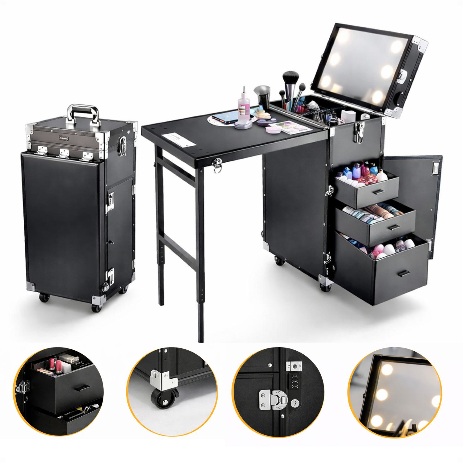 A Maleta Mesa Portátil Índice Tokyo KC-493 é a solução completa para profissionais de manicure, maquiagem e beleza que precisam de mobilidade, organização e apresentação profissional. Funciona como carrinho de transporte e se transforma em uma estação de trabalho completa, com mesa dobrável, gavetas organizadoras, espelho iluminado e sistema de som integrado.
