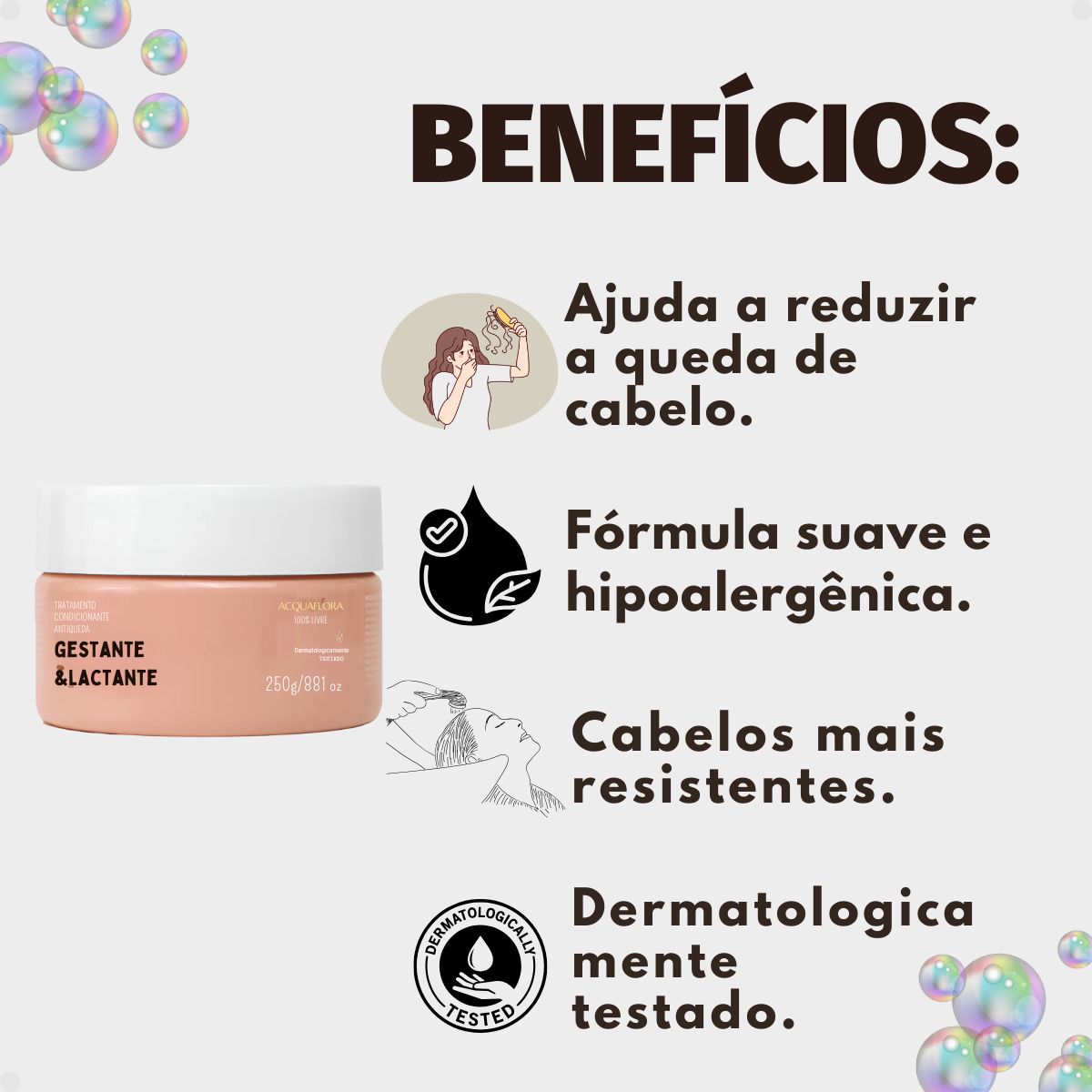 A Máscara Tratamento Condicionante Antiqueda Acquaflora é perfeita para mulheres em fase de gestação e amamentação que desejam cuidar da saúde de seus cabelos, prevenindo e tratando a queda capilar que pode ocorrer durante esses períodos. Ideal para ser incorporada na rotina de cuidados capilares, garantindo fios fortes e saudáveis.