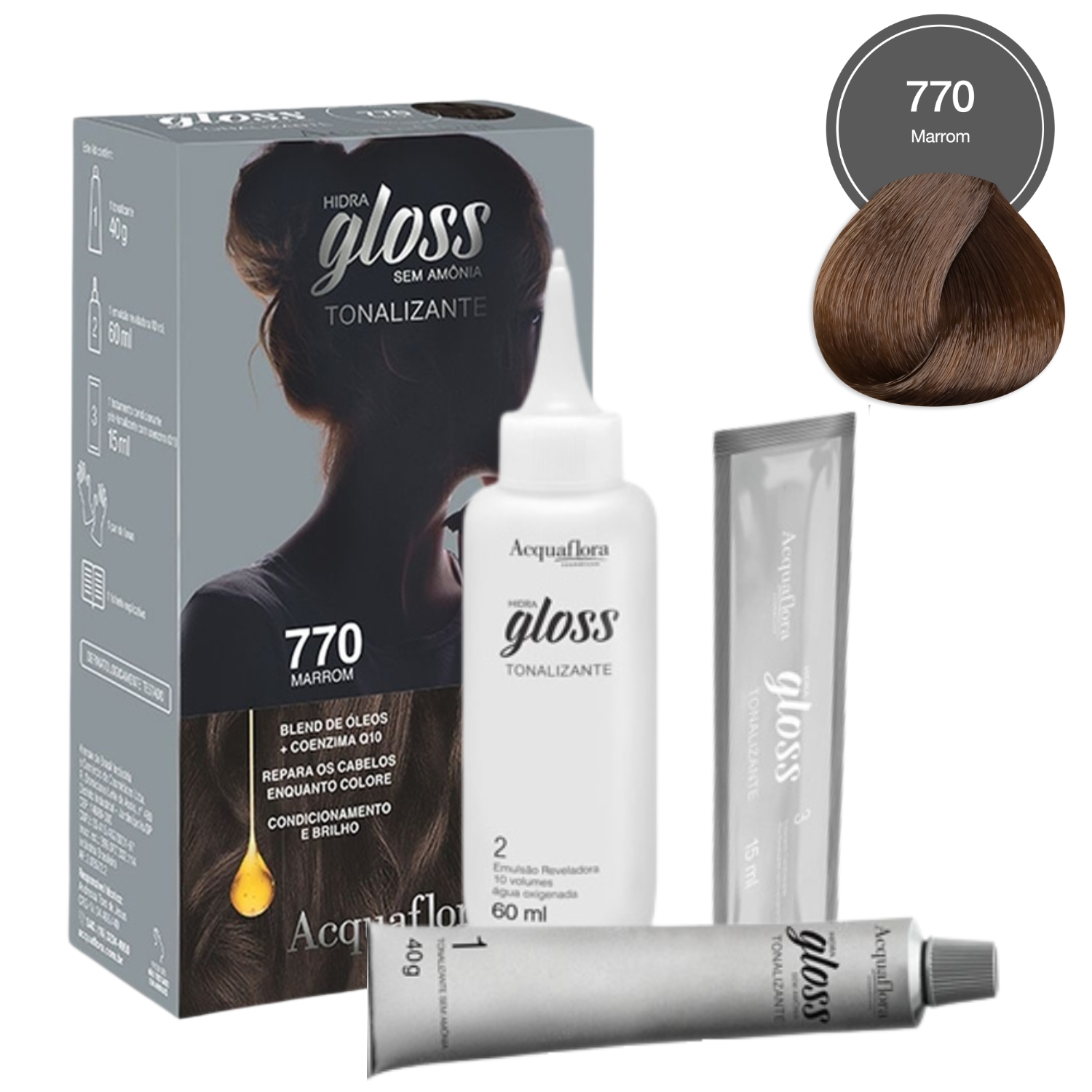 - 01 Tonalizante Sem Amônia Acquaflora Hidra Gloss 770 Marrom 40g;