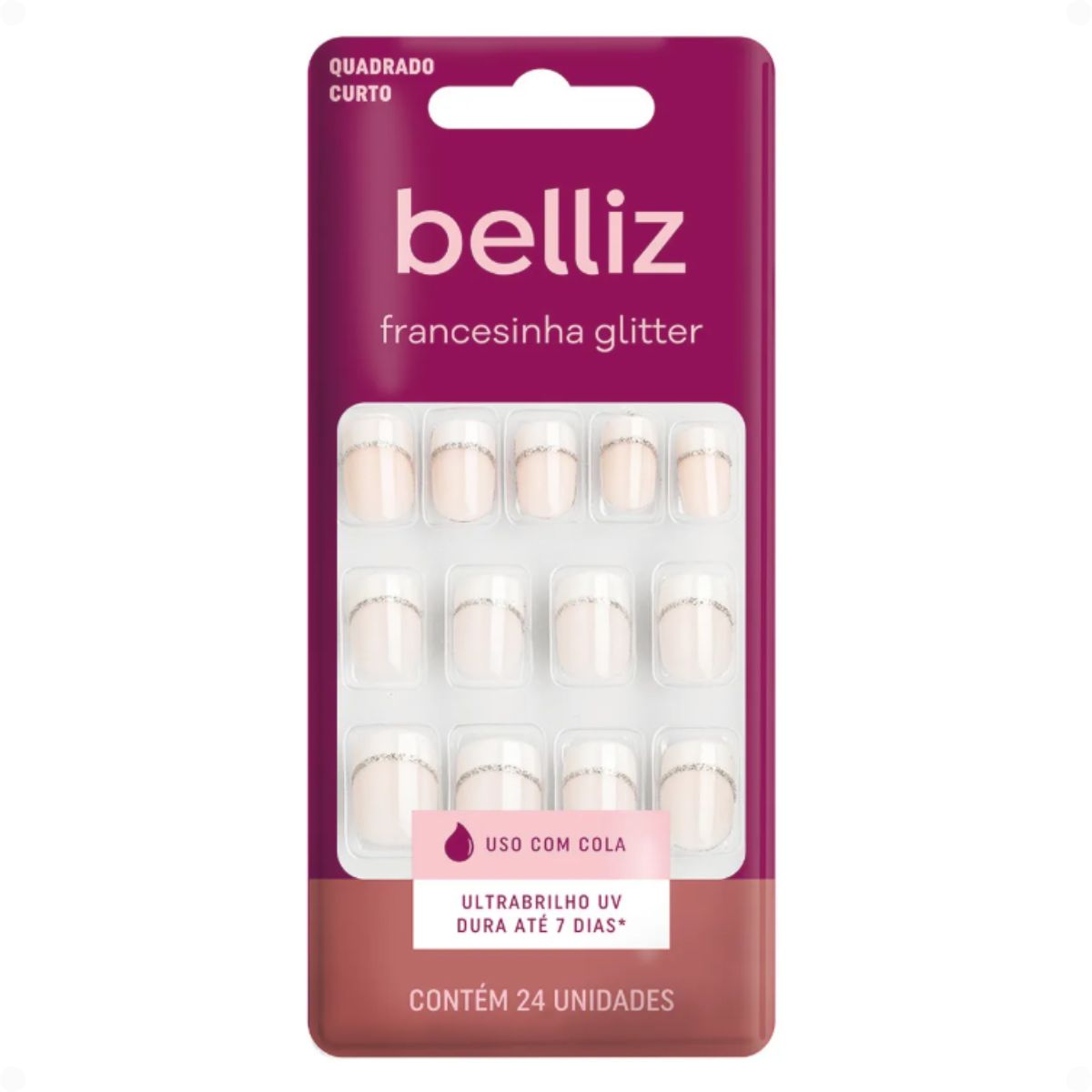 Unhas Postiças Belliz Francesinha Glitter Quadrado Curto Com 24 unidades Cód.:1206